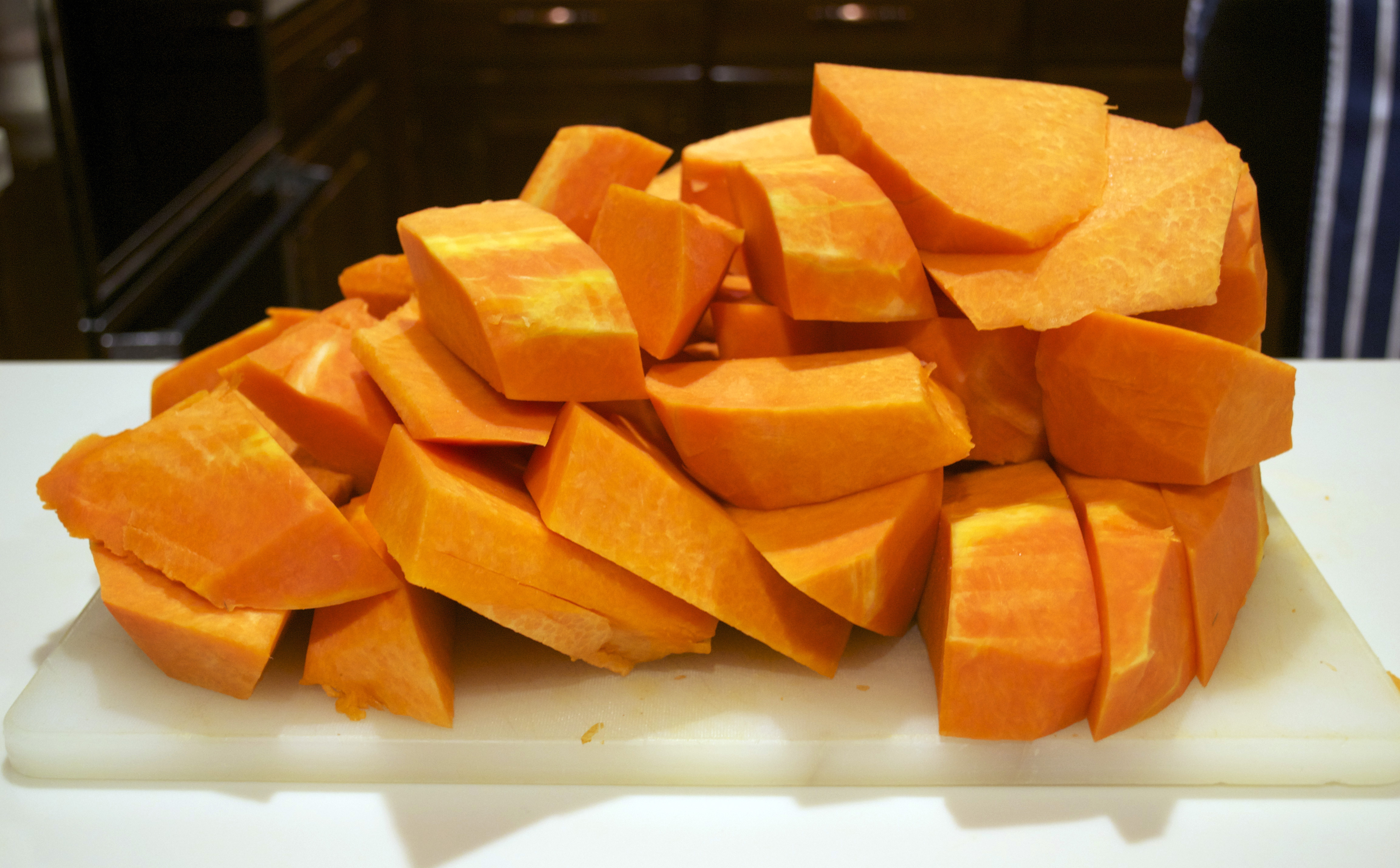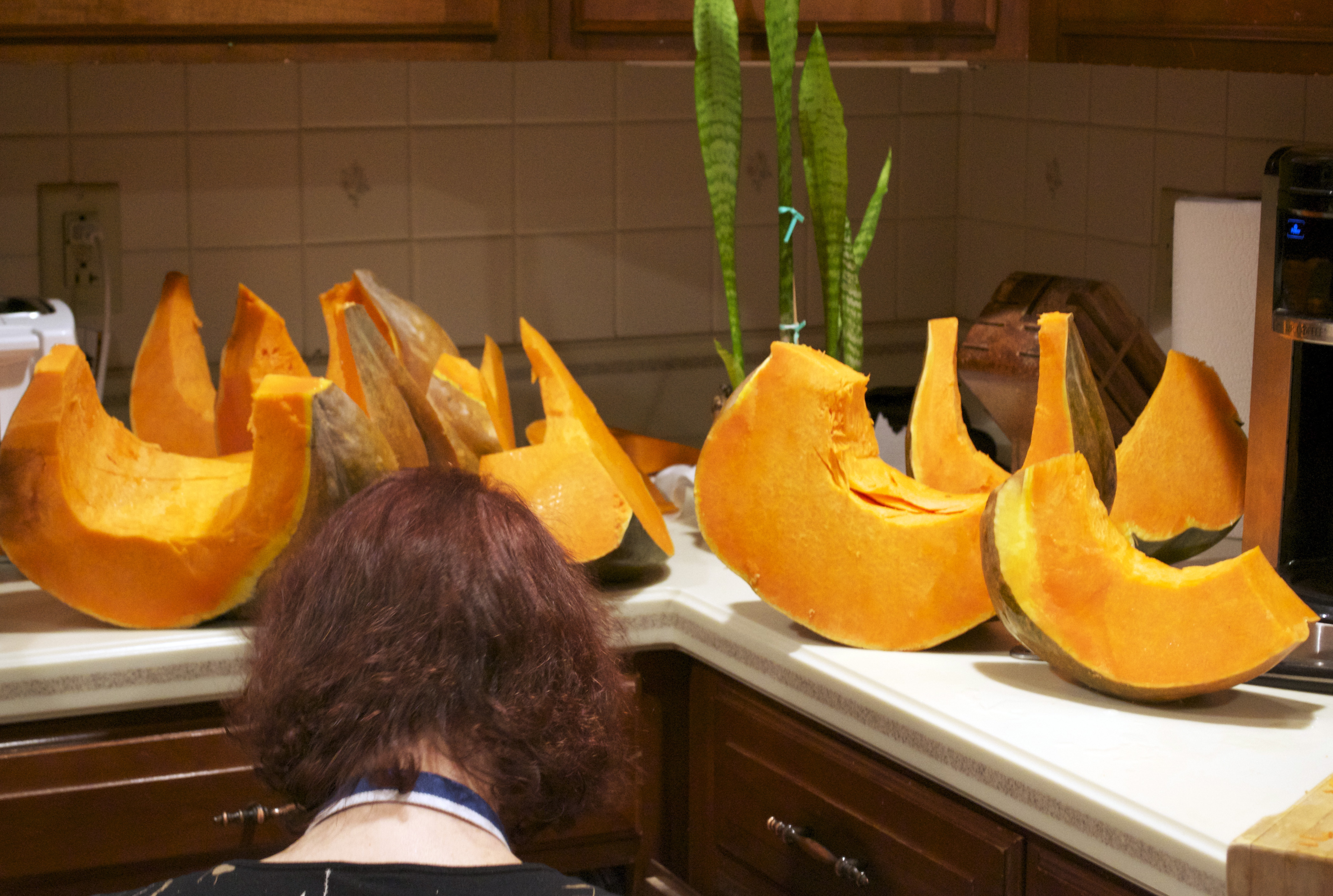 Stephen’s mom spent all of Tuesday night cutting the pumpkin into giant viking ship shaped wedges and then into large chunks to broil & steam and then puree. She really labored over this pumpkin in a very impressive way. Seeing as she had too much pumpkin for her to feasibly use in the next couple of yeeears she sent me home packing with two large bags of raw pumpkin squares and one large bag of puree. I was more than happy to take some extra pumpkin off her hands. I have plenty of ideas for delectable looking pumpkin dishes I want to make over the duration of the holiday season.