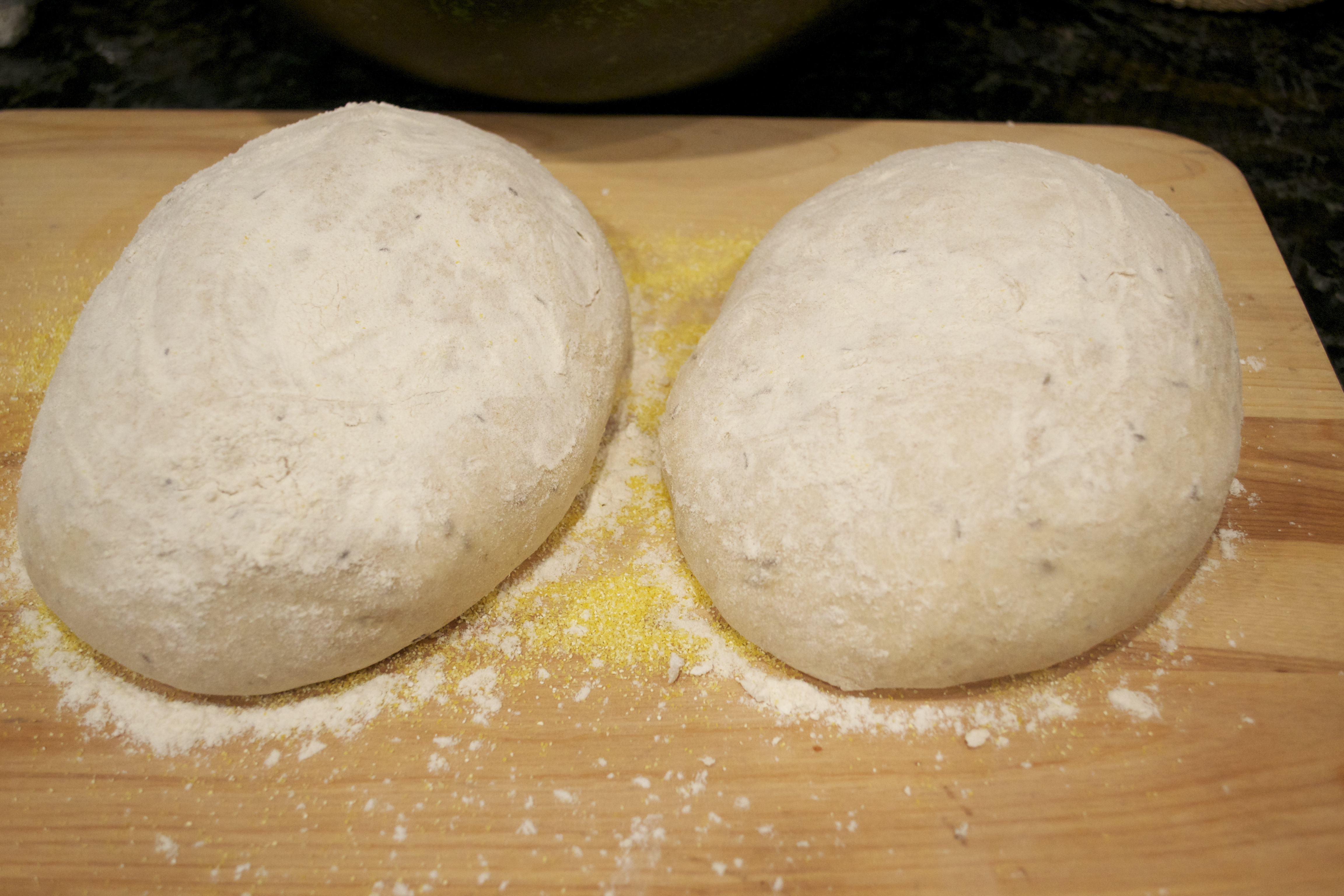 When the dough has finished rising, preheat your oven to 450F degrees. Place a pizza stone in the oven on a center rack and allow it to reach oven’s temperature. Cover a pizza peel with cornmeal. If you don’t have a pizza peel, like me, a large wooden cutting board will do the trick. Divide the dough into the desired number of loaves and shape into oval by pulling the top of the dough towards the bottom of the loaf while turning it and elongated the loaf when you’ve accomplished a smooth top. Don’t worry about the bottom not being smooth, it will cook into a nice flat, crunchy crust. Let the loaves sit on the prepared pizza peel/cutting board for about 40 minutes before baking. Cover each loaf with about 1tbsp of flour and spread with your hand. Make 5 slashes across the top with a serrated knife.
