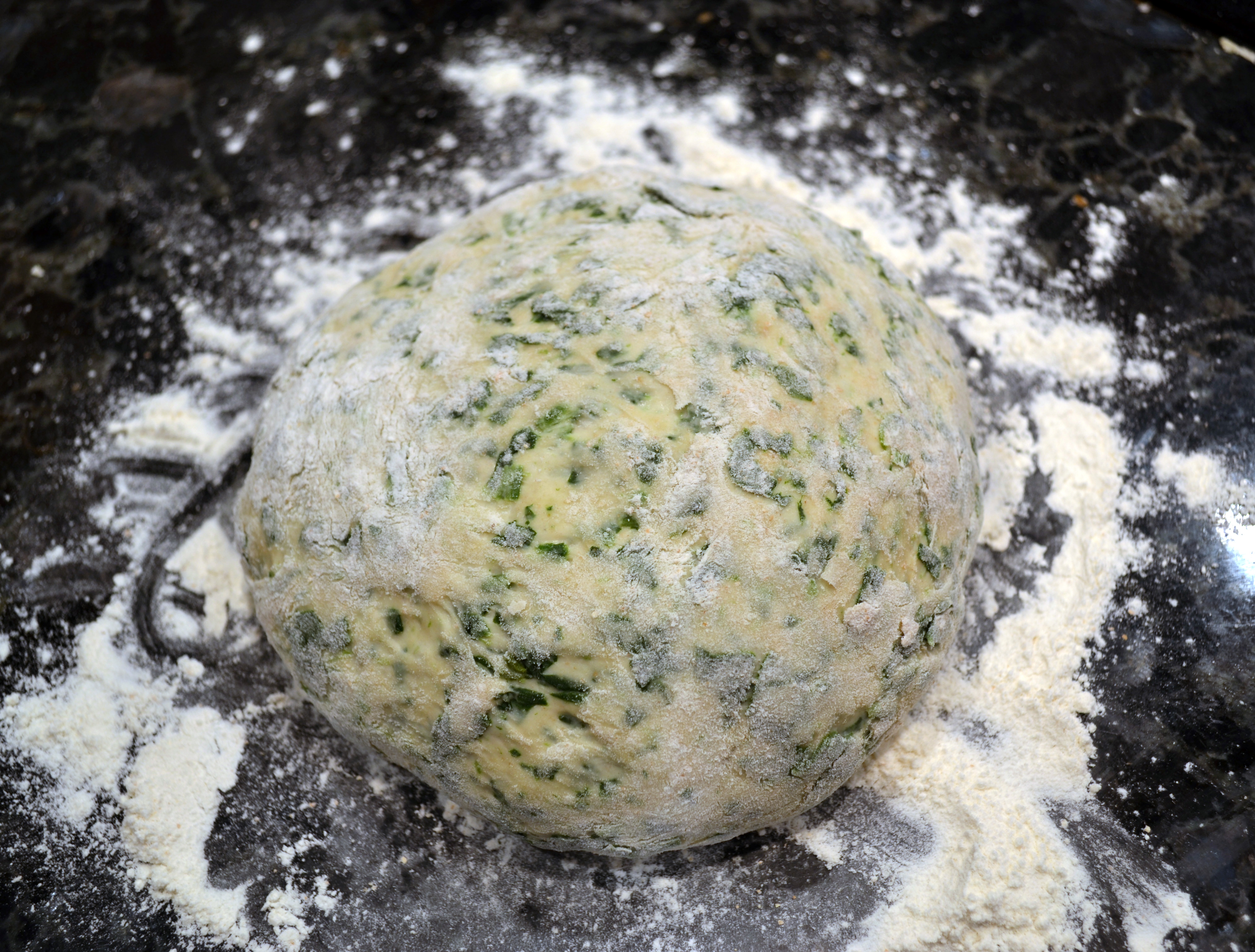 Stir the spinach into the yeast mixture. Add flour and stir with a wooden spoon to form a ball. You may need a bit more liquid depending on your spinach. Just enough to have a non-sticky dough. You want to be able to run your hand over it without being covered in gooey dough.