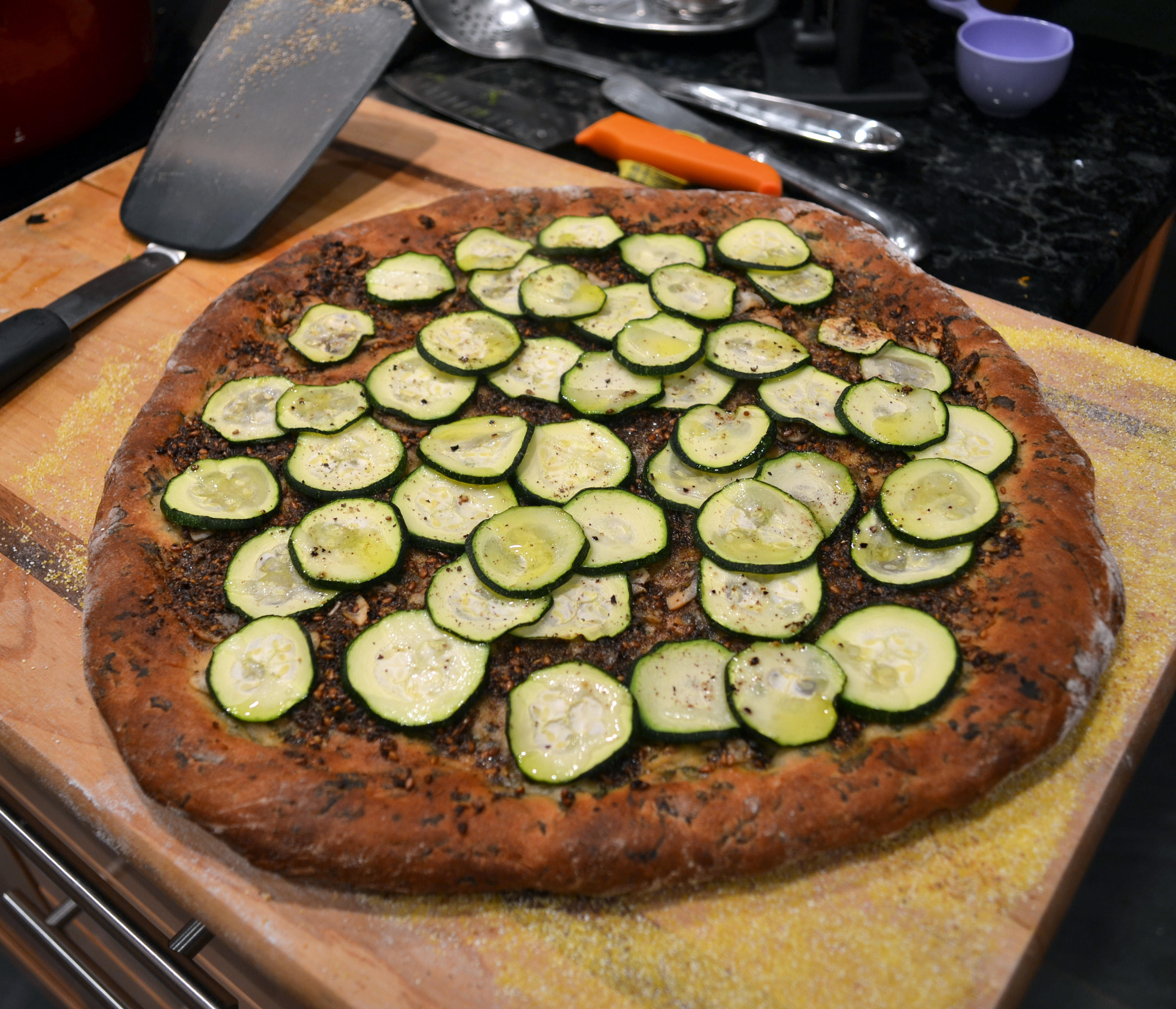 To make the sauce just combine the zaatar, olive oil, garlic, salt, and pepper in a small dish. It should be like a paste. Spread on dough. Cover with zucchini slices and bake for about 15 minutes. Honestly, the baking time will vary with how dark/crispy you like your crust and how baked you want your zucchini. I pre-baked my crust on a pizza stone so mine turned out quite dark but my zucchini was just cooked, not browned.