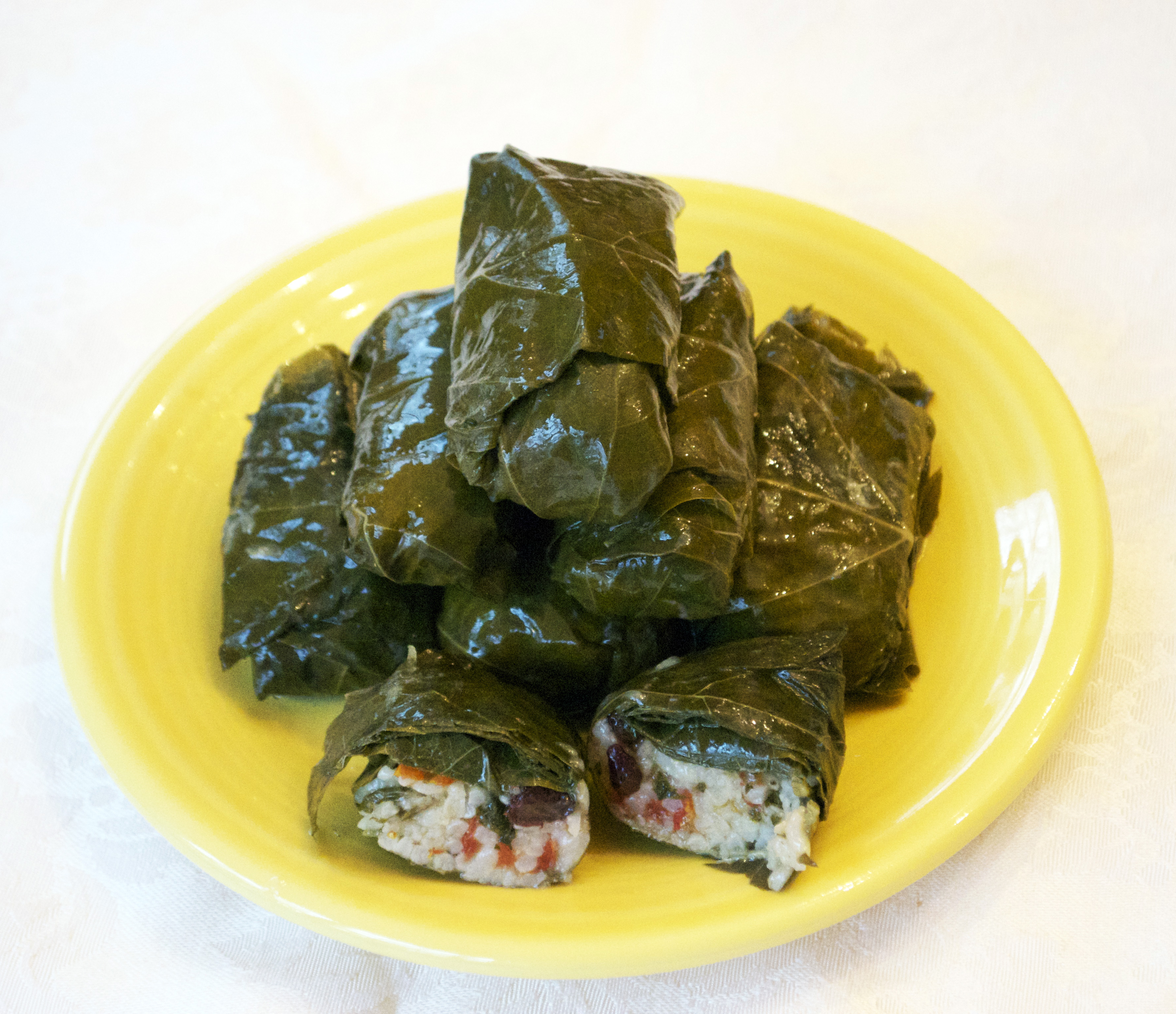If my directions make absolutely no sense because I am completely incompetent at explaining kitchen techniques… I’m more of a teach by show kinda gal…. there is a wonderful series of pictures at SouSou Kitchen that show the steps to rolling a grape leaf…. I suggest you visit the site since I don’t even think I understand what I’m explaining. Maybe it’s because it’s really quite simple  – I swear!