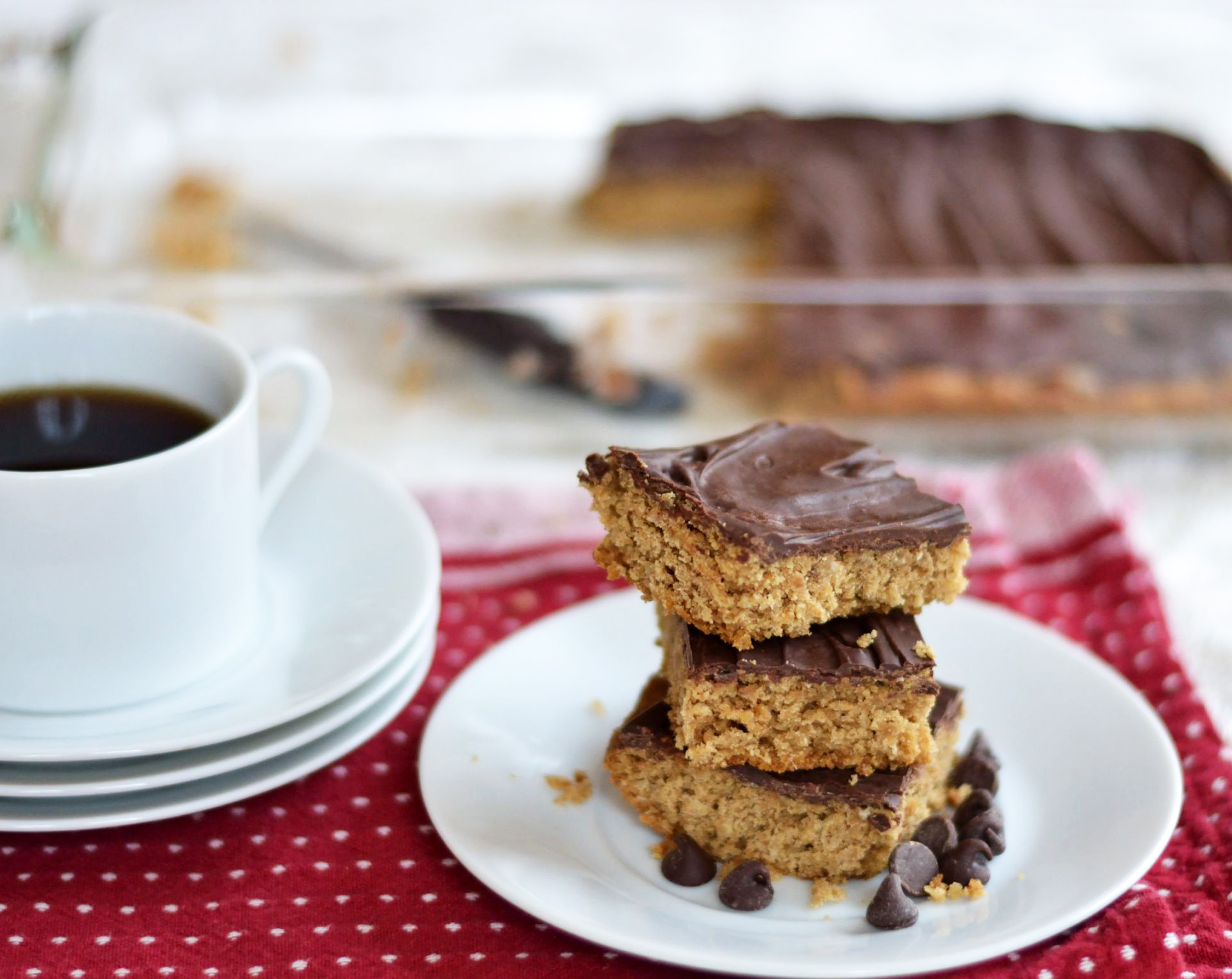 It’s easy to eat 1/2 a pan because they’re not too sweet, just sweet enough, and almost fool you into thinking they might be healthy.ish. And the flavors of peanut butter & chocolate flood your mouth as your teeth sink into the soft, chewy bars.