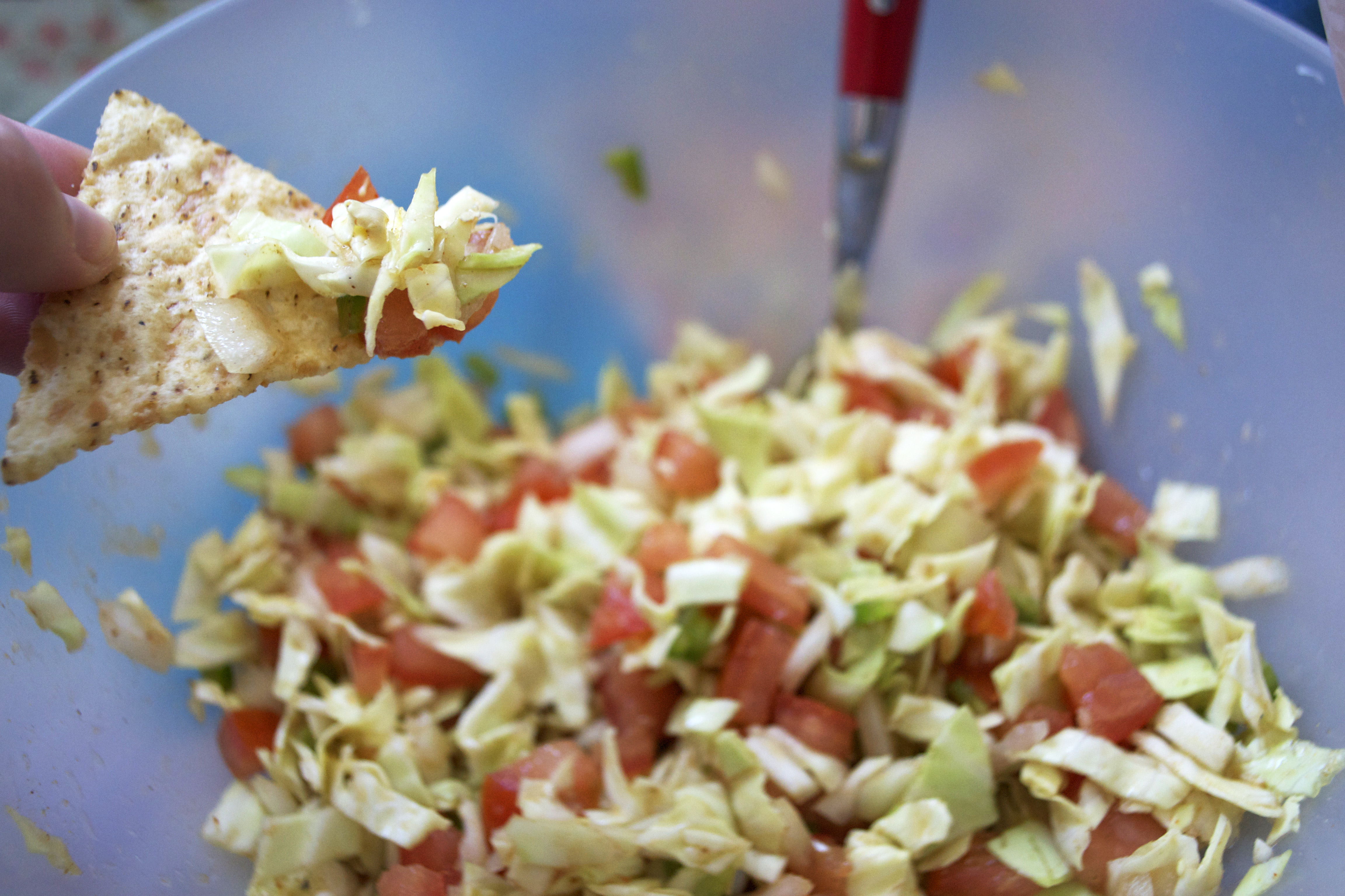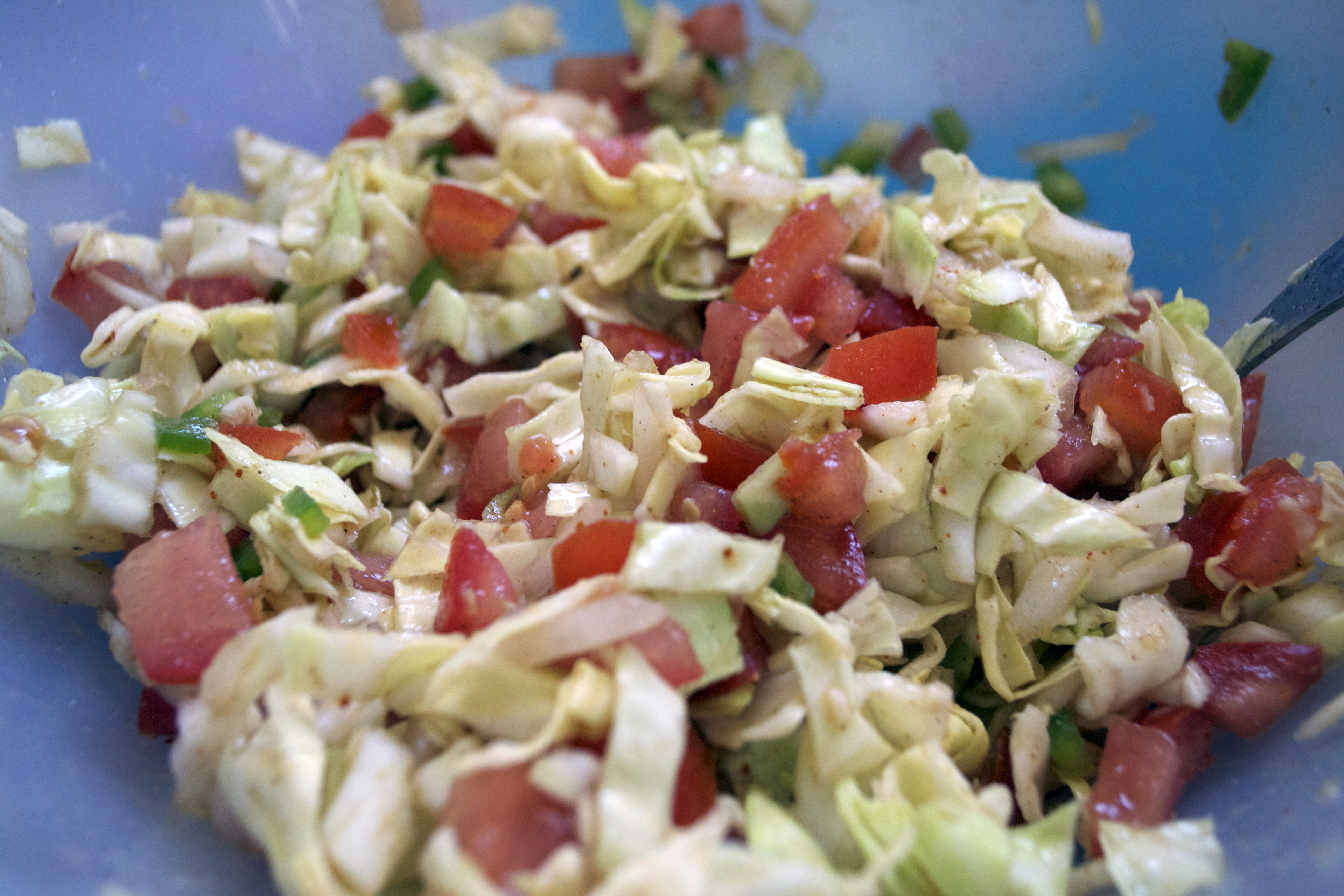 In a medium/large bowl combine cabbage, tomatoes, onion, jalapeño and garlic. Toss together. Squeeze in lime juice. Add cumin & chipotle. Toss & taste. You may decide not to add sweetener or salt. I liked a little of both. Definitely be careful with the sweetener though. I accidentally added a touch too much the first time I made it.